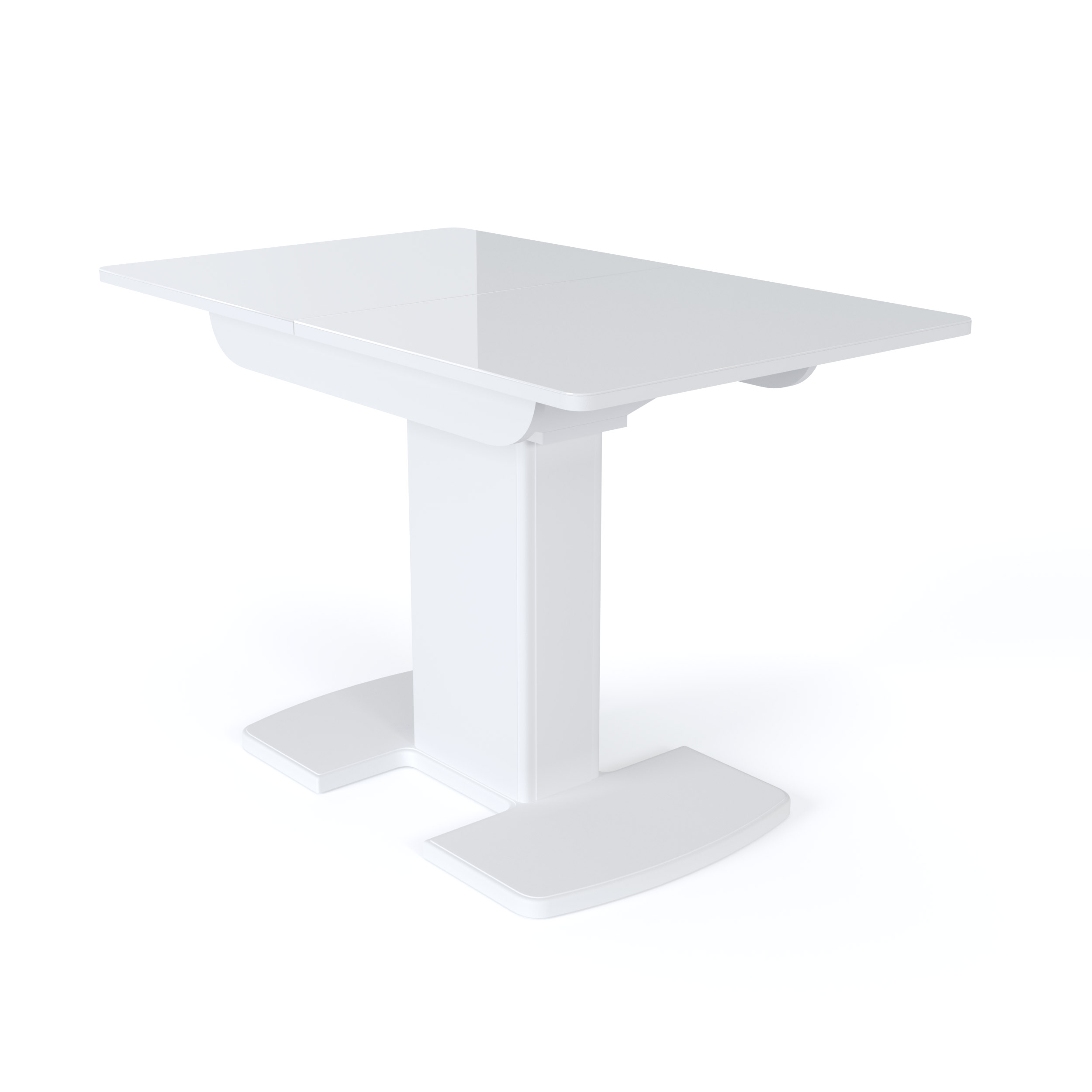 Небольшой раскладной стол для кухни.  Каркас – качественные ДСП, столешница прямоугольной формы из МДФ и матового или глянцевого закаленного стекла имеет размер 110 см, легко раскладывается до 140 см. Опирается стол на одну устойчивую ногу, переходящие в две плоские опоры на полу, что гарантирует устойчивость и надежность конструкции.